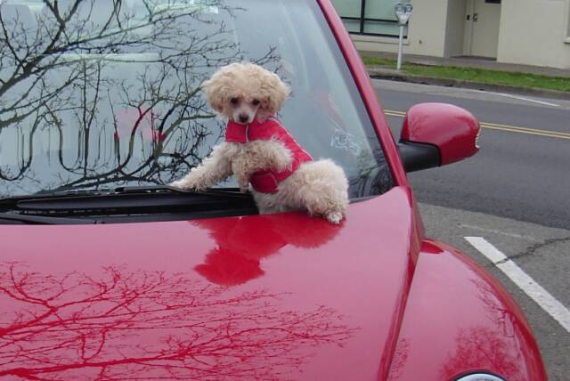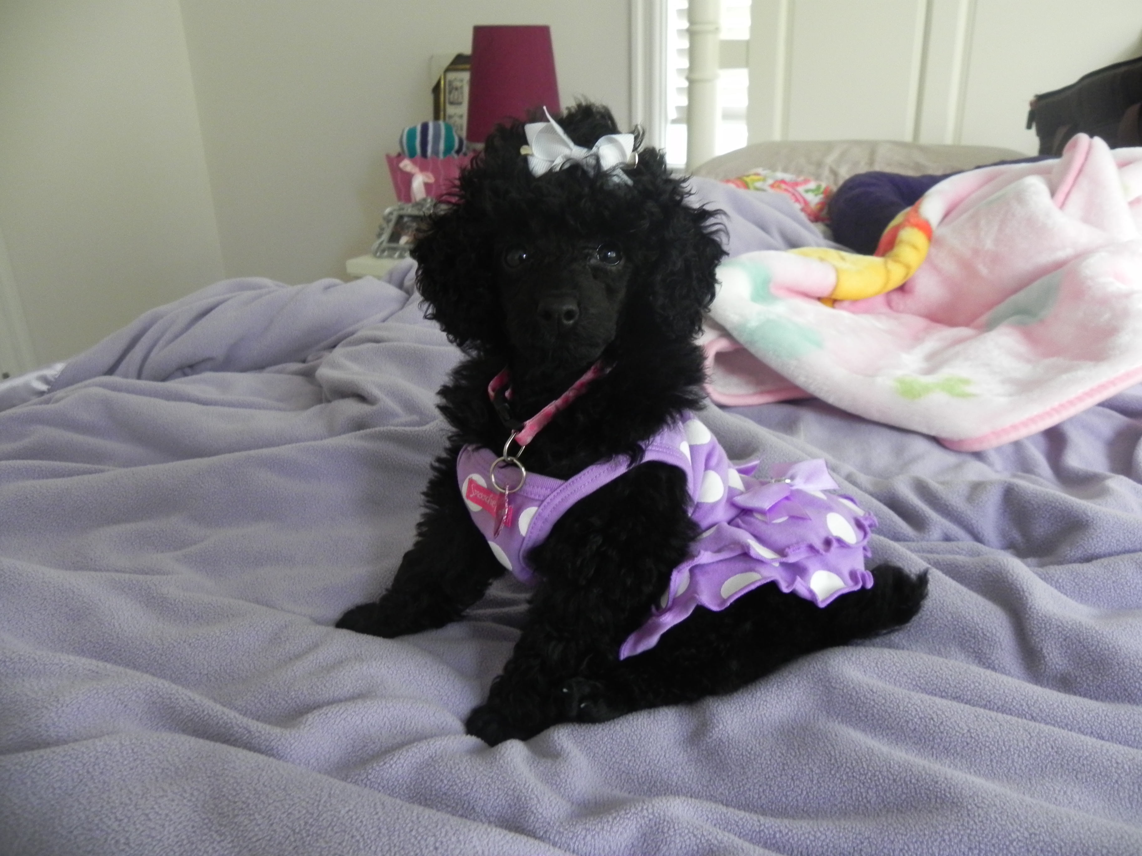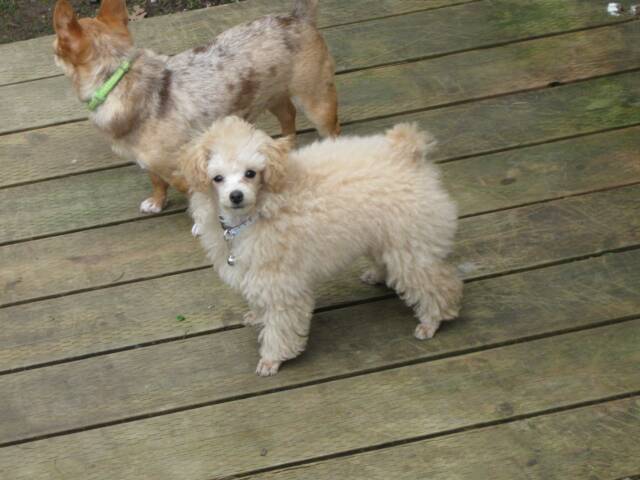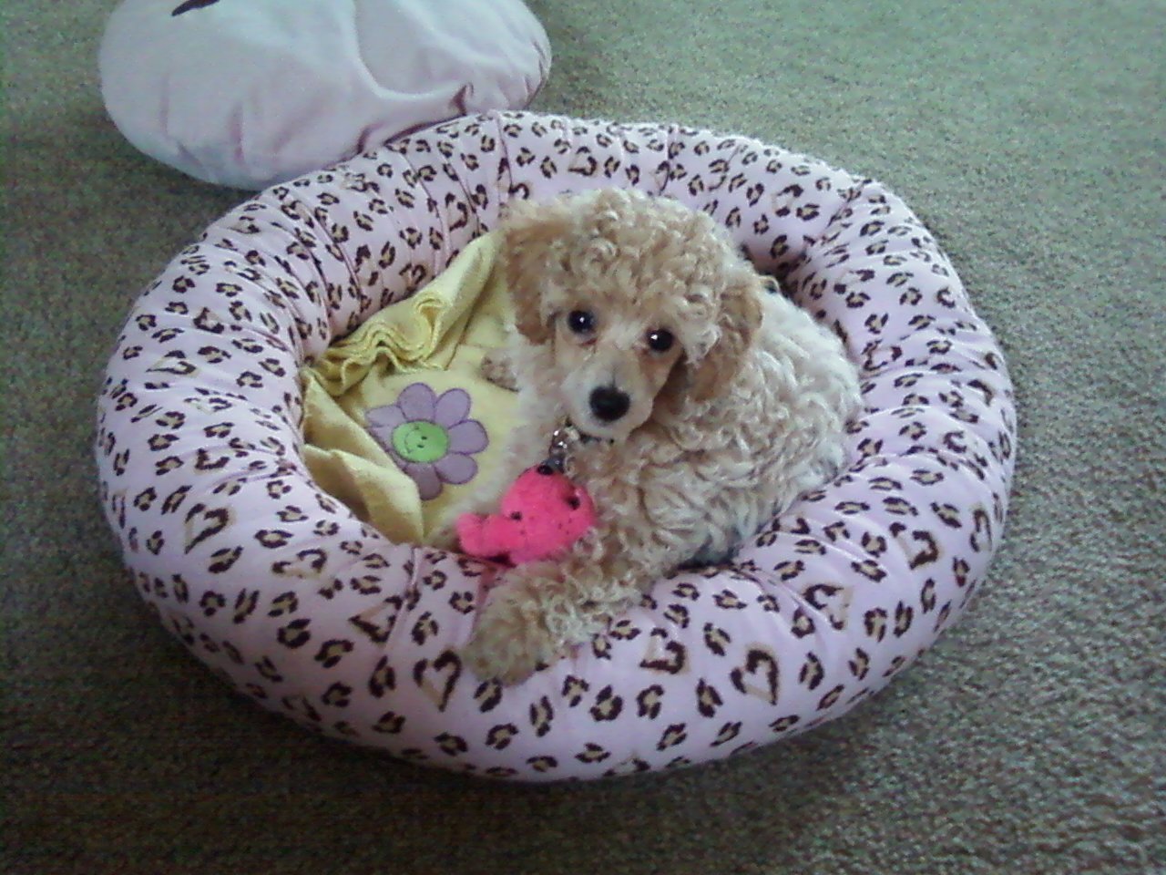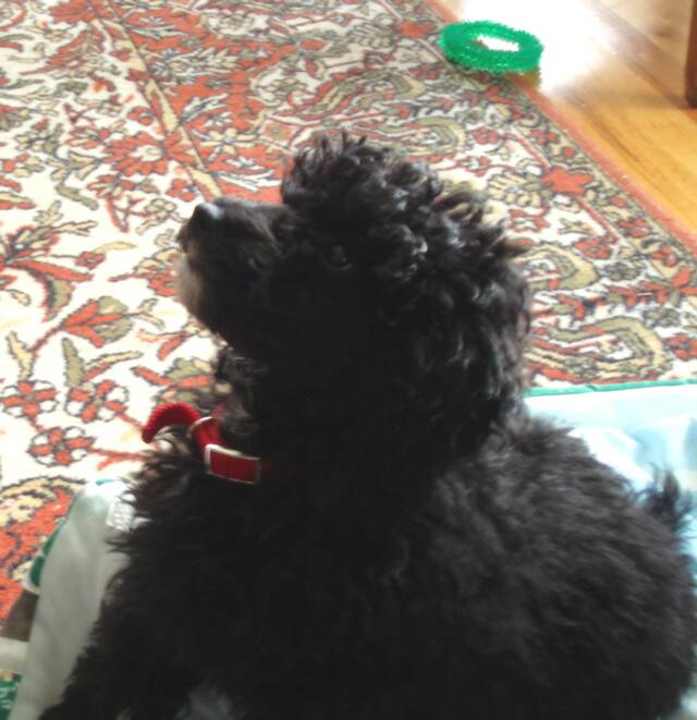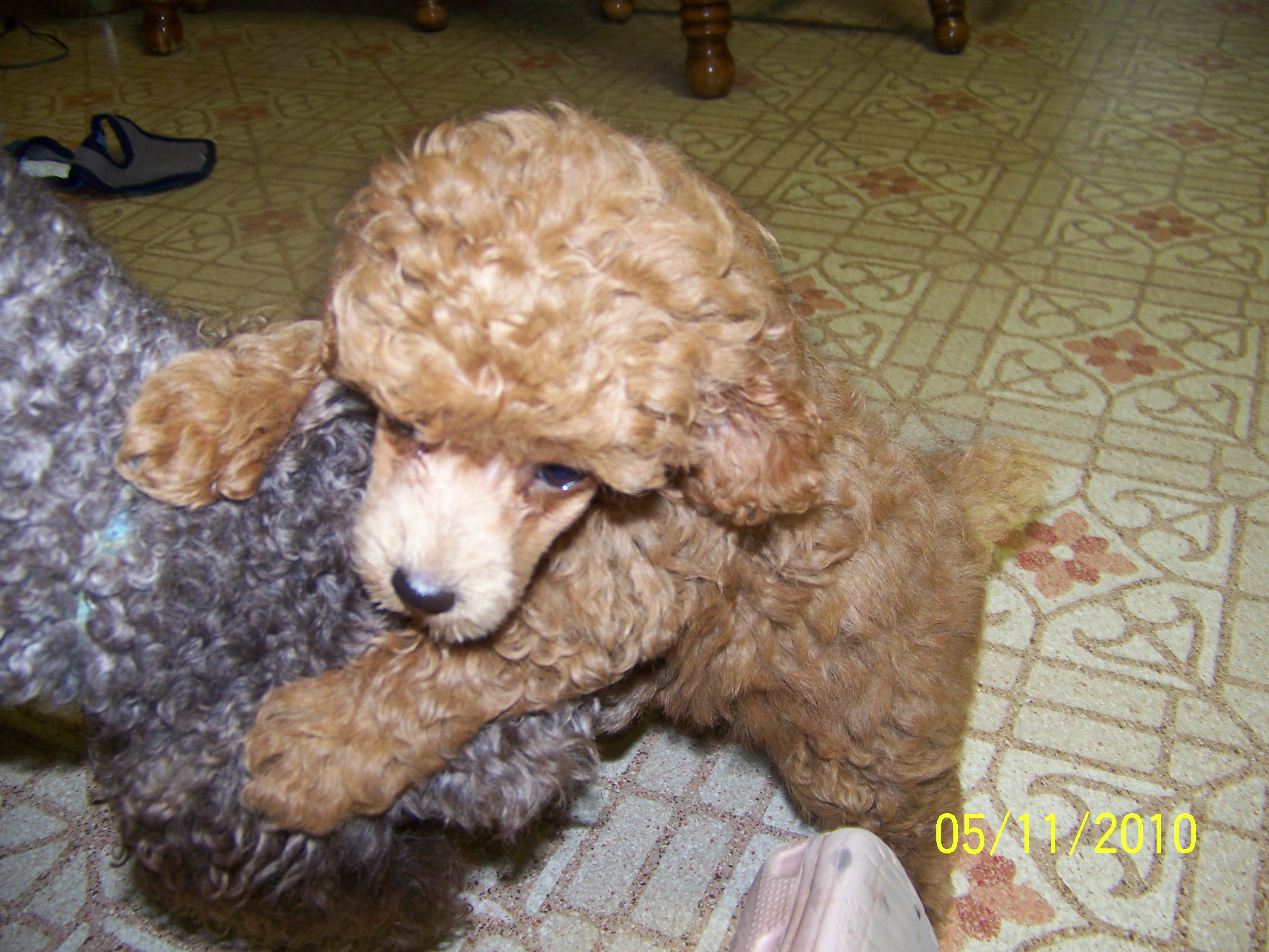 I knew that poodles are very intelligent breed, but couple of days ago Josie surprised us. We have a china hutch and usually she crawls under it to get the ball. We had one of her toys tied to the rope and put under the hutch. She did not crawl this time, but pulled the rope to get her toy. No one taught her this, she just figured out by herself and now she does this every time. What a smart puppy!!