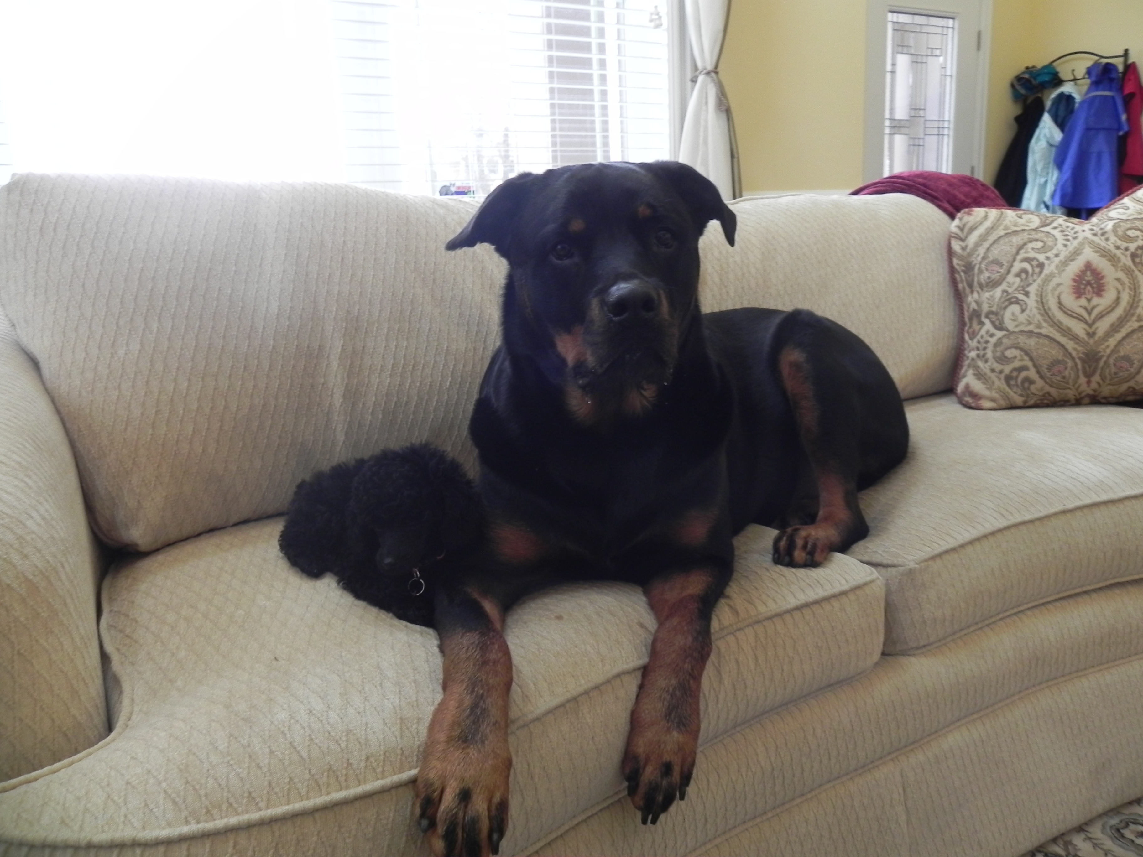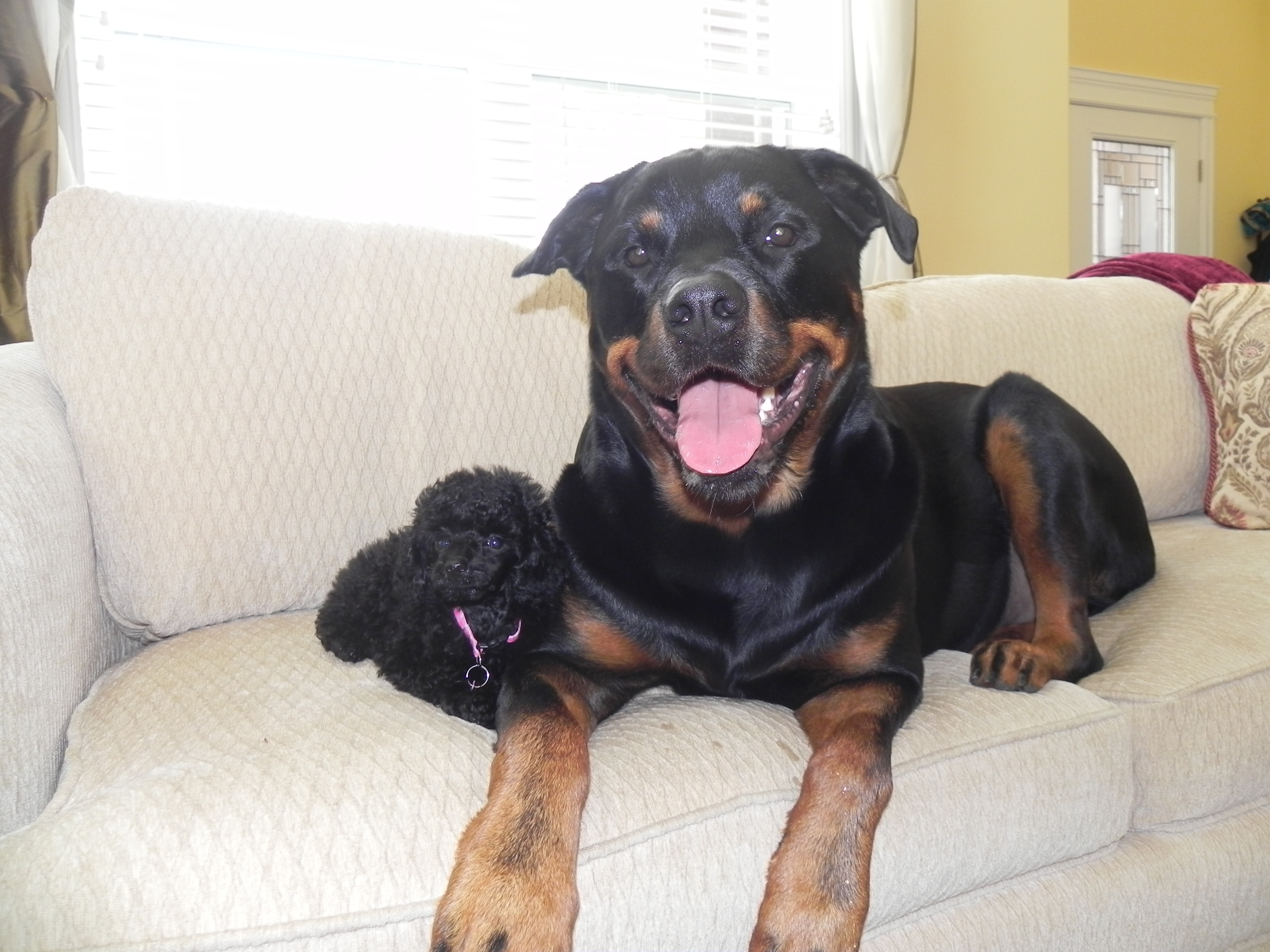 I just wanted to give you an update on Little Missy. She is doing great. Shes growing so fast. She has such a funny personality. Whenever we're out and about, she's calm and quiet. As soon as we get home, she's a little monster (a good one, of course). We have a 4500 square foot home and she runs through every square inch and still has energy. We get a work out running after her. Our rottie, Taz, loves her. Missy bits his ears and nose and he just sits there and takes it. He likes makes sure shes okay running around the house. Every time someone wants to hold her, Taz watches them like an eagle, making sure they don't hurt her. He thinks he's her babysitter. When he's sitting on our couch, his feet hang off the edge and Missy likes to jump up and bite them while he's sleeping. She thinks its a game. Taz has learned to sleep through it.